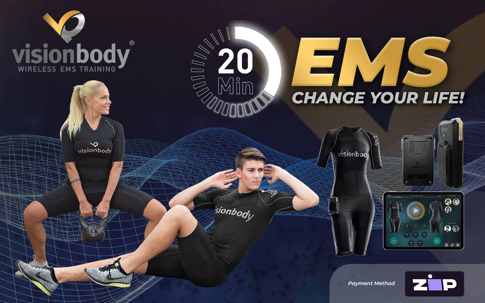 EMS stands for Electro muscle stimulation. Simply put the Visionbody suit sends electrical impulses to your muscles to promote muscle contractions also known as tension. The same happens with regular exercising when you lift weights, move with speed or intensity. What makes the suit so special is that every second of your workout you will be recruiting muscles from your full body, activating more muscle and therefore ramping up your caloric burn and strengthening every part of your body. EMS causes Slow-twitch (used for endurance) and Fast-twitch (used for strength and power) muscle fibers to contract, providing benefits to your strength, endurance, and recovery from training. EMS training with the Visionbody system applies tension to your whole body and forces your muscles to adapt and grow stronger & faster than with regular training. It is also a perfect add on to your regular training routine like tennis, soccer, running, and fitness training. Simply combine it with the exercises you love and power up your training.